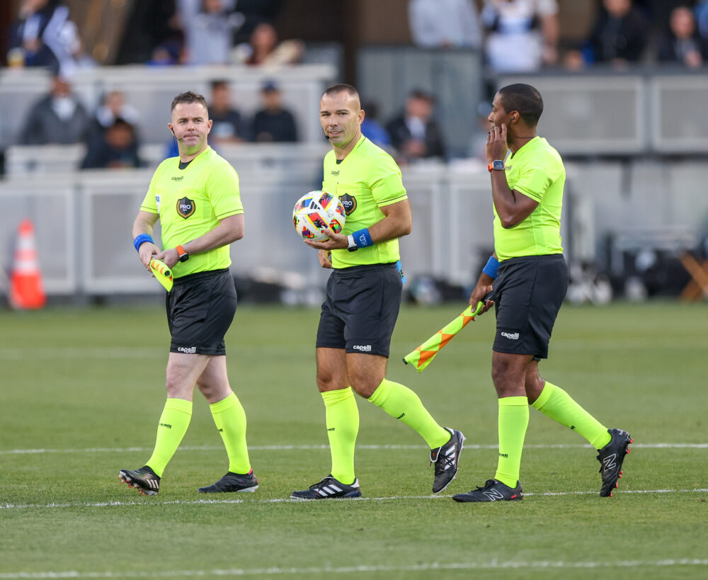 PRO Refereeās CHRIS PENSO (center) along with his crew of CHRIS ELLIOTT (left) and EDUARDO JEFF (right) walk to the center spot before the MLS match between the San Jose Earthquakes and Austin FC at PayPal Park in San Jose, California