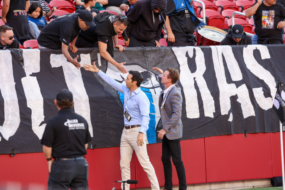 San Jose Earthquakes General Manager CHRIS LEITCH and Interim Head Coach IAN RUSSELL welcome the San Jose Ultras Supporter Group before the Leagues Cup match between the San Jose Earthquakes and Chivas Guadalajara, Levi’s Stadium, Santa Clara, California