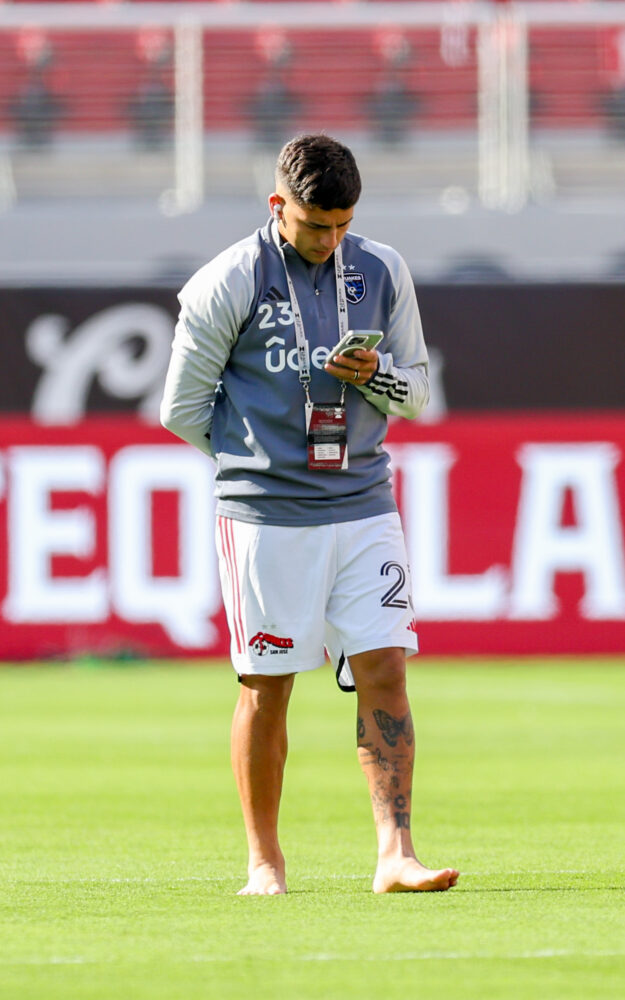 San Jose Earthquakes Midfielder HERNÁN LÓPEZ (23) takes some quiet time before the Leagues Cup match between the San Jose Earthquakes and Chivas Guadalajara, Levi’s Stadium, Santa Clara, California