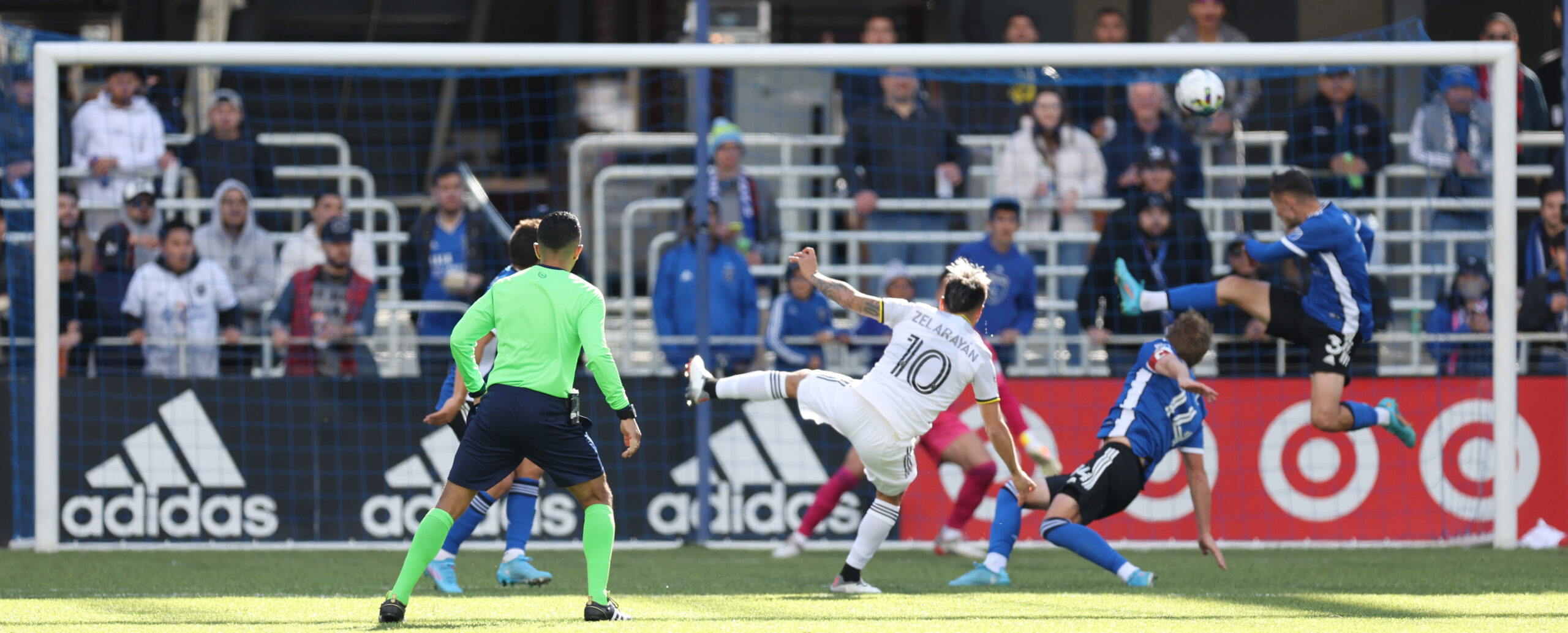 Columbus Crew Midfielder LUCAS ZELARAYĆN (10) shoots against San Jose Earthquakes Goalkeeper JT MARCINKOWSKI (1) and the San Jose Earthquakes defenders for a goal during the MLS match between the San Jose Earthquakes and Columbus Crew at PayPal Park in San Jose, California