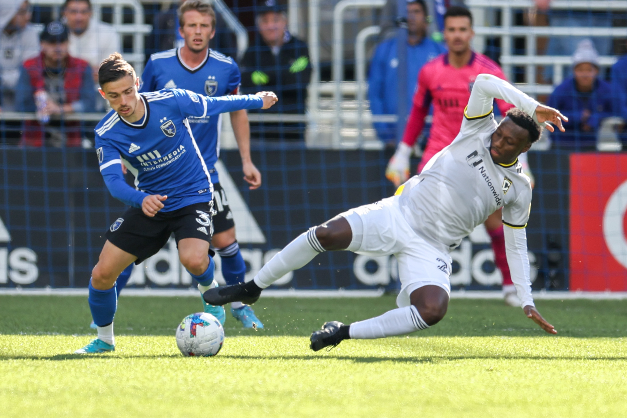 Columbus Crew Midfielder DERRICK ETIENNE (22) jumps to the ball to prevent San Jose Earthquakes Defender PAUL MARIE (3) from reaching it during the MLS match between the San Jose Earthquakes and Columbus Crew at PayPal Park in San Jose, California