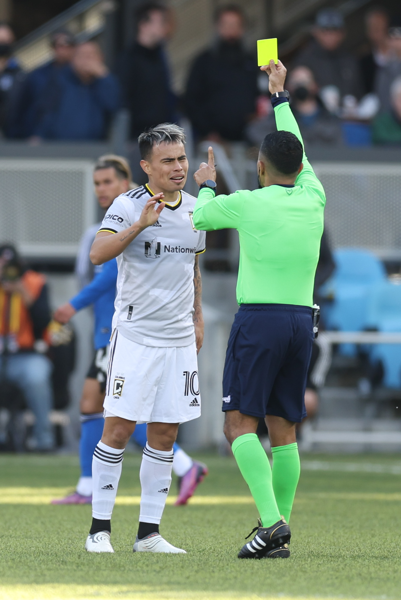 Referee GUIDO GONZALES JR issues Columbus Crew Midfielder LUCAS ZELARAYĆN (10) a yellow card during the MLS match between the San Jose Earthquakes and Columbus Crew at PayPal Park in San Jose, California