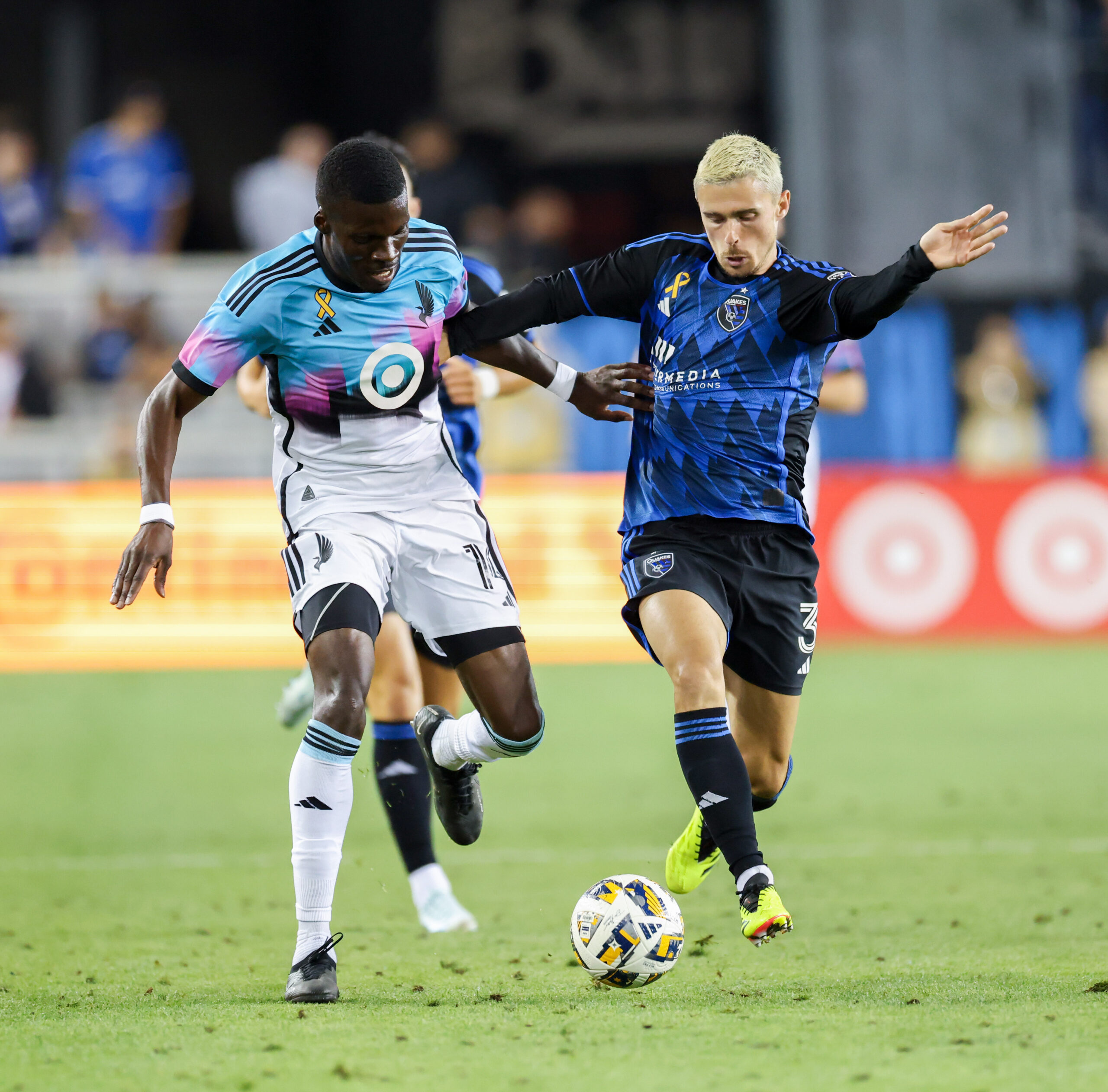 Minnesota United Forward TANI OLUWASEYI (14) and San Jose Earthquakes Defender PAUL MARIE (3) battle for the ball during the MLS match between the San Jose Earthquakes and Minnesota United at PayPal Park in San Jose, California
