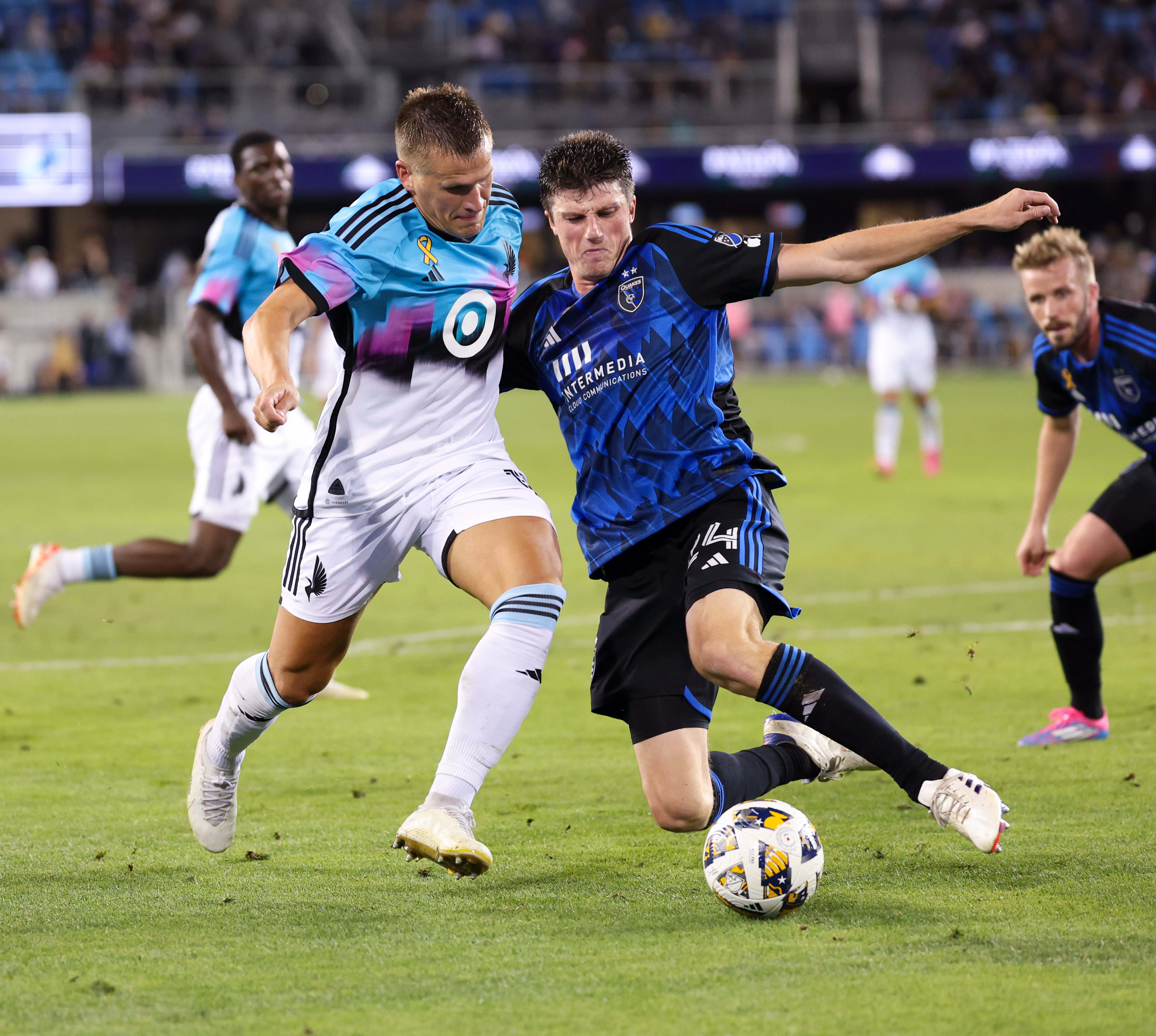 San Jose Earthquakes Defender DANIEL MUNIE (24) tackles the ball away from Minnesota United Midfielder ROBIN LOD (17) during the MLS match between the San Jose Earthquakes and Minnesota United at PayPal Park in San Jose, California