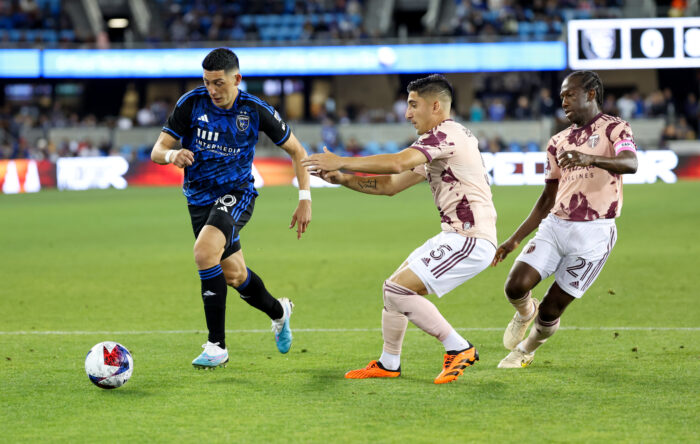 San Jose Earthquakes Midfielder CRISTIAN ESPINOZA (10) dribbles near the top of the box with pressure from Portland Timbers Defender CLAUDIO BRAVO (5) and Portland Timbers Midfielder DIEGO CHARA (21) during the MLS match between the San Jose Earthquakes and the Portland Timbers at PayPal Park in San Jose, California