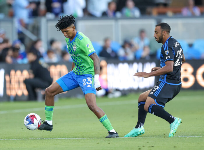 Seattle Sounders Midfielder LÉO CHÚ (23) controls the ball with pressure from San Jose Earthquakes Defender CARLOS AKAPO (29) during the MLS match between the San Jose Earthquakes and the Seattle Sounders at PayPal Park in San Jose, California