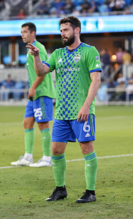 Seattle Sounders Midfielder JOÃO PAULO (6) signals to a teammate before a corner kick during the MLS match between the San Jose Earthquakes and the Seattle Sounders at PayPal Park in San Jose, California