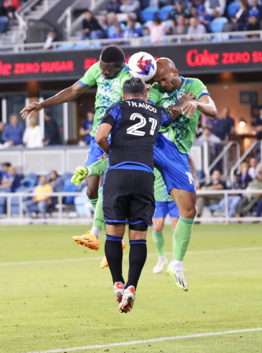 San Jose Earthquakes Defender MIGUEL TRAUCO (21) defends a header attempt from Seattle Sounders Forward HÉBER (19) and Seattle Sounders Defender NOUHOU (5) during the MLS match between the San Jose Earthquakes and the Seattle Sounders at PayPal Park in San Jose, California