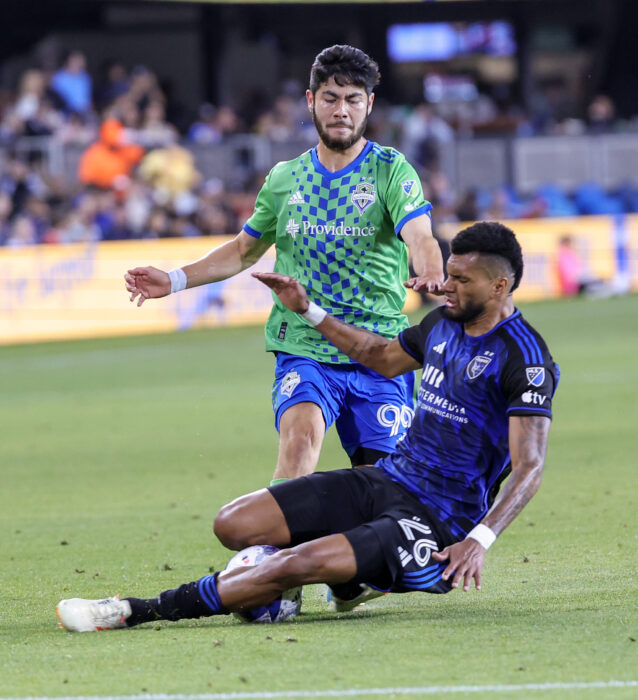 San Jose Earthquakes Defender RODRIGUES (26) slide tackles away the ball from Seattle Sounders Midfielder DYLAN TEVES (99) during the MLS match between the San Jose Earthquakes and the Seattle Sounders at PayPal Park in San Jose, California
