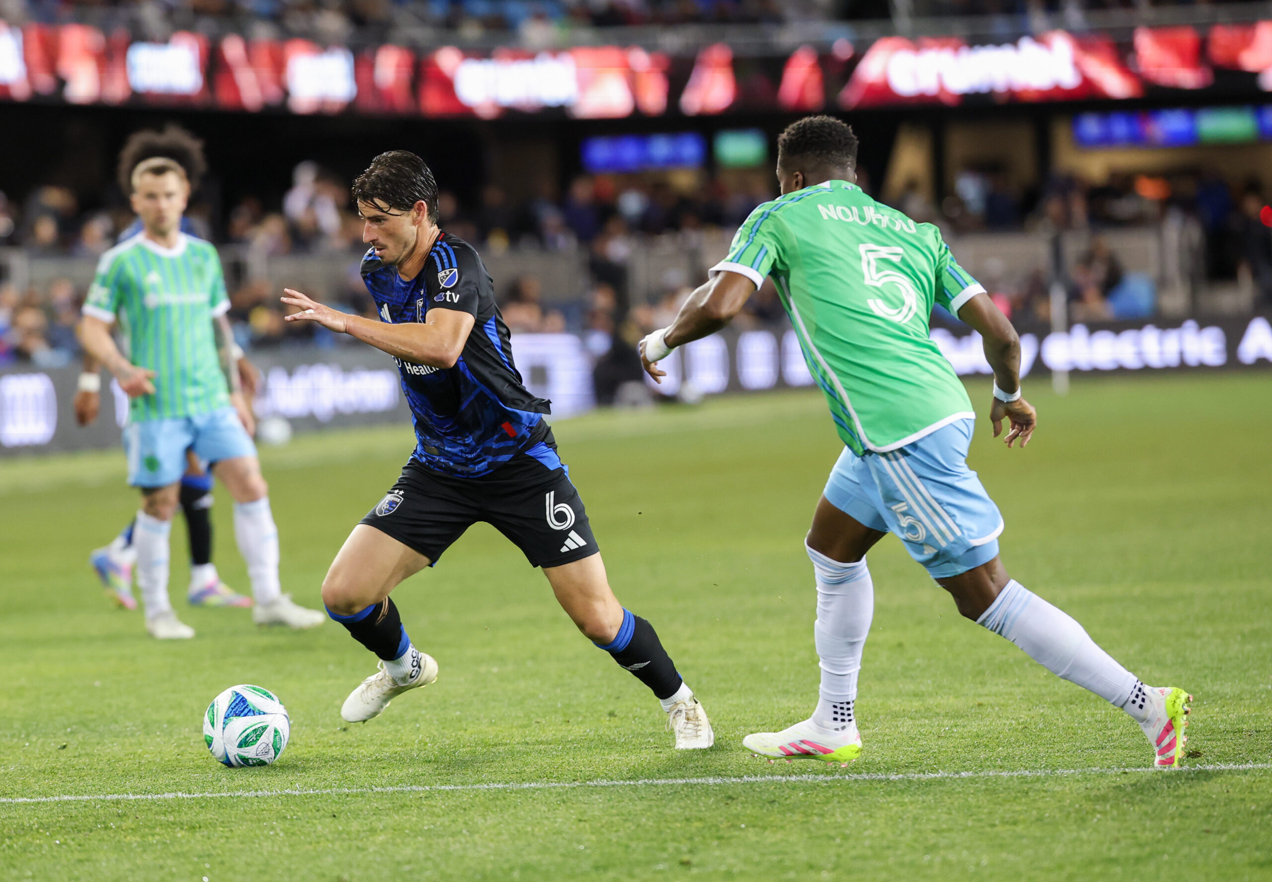 San Jose Earthquakes Midfielder IAN HARKES (6) breaks toward the end line against Seattle Sounders Defender NOUHOU (5) during the MLS match between the San Jose Earthquakes and the Seattle Sounders at PayPal Park in San Jose, California