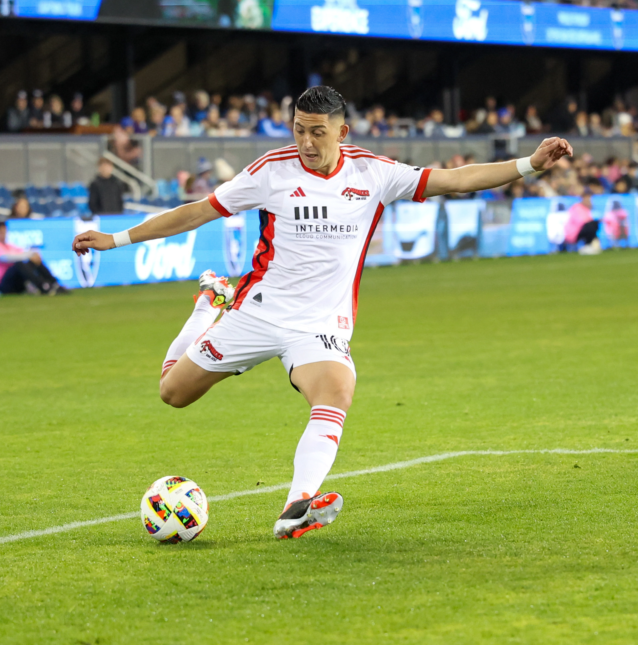 San Jose Earthquakes Midfielder CRISTIAN ESPINOZA (10) crosses the ball during the MLS match between the San Jose Earthquakes and the Vancouver Whitecaps at PayPal Park in San Jose, California