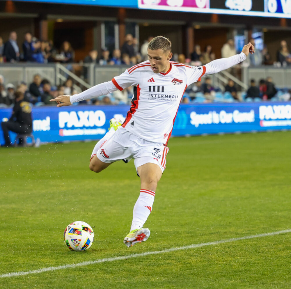 San Jose Earthquakes Defender PAUL MARIE (3) crosses the ball during the MLS match between the San Jose Earthquakes and the Vancouver Whitecaps at PayPal Park in San Jose, California