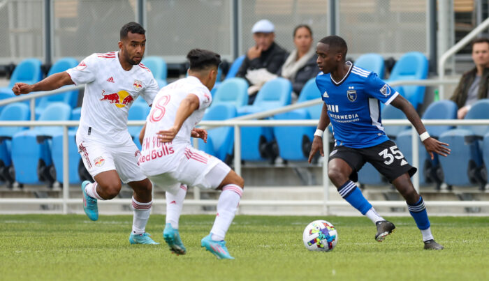 San Jose Earthquakes Midfielder JAMIRO MONTEIRO (35) looks for space between New York Red Bulls Midfielder FRANKIE AMAYA (8) and New York Red Bulls Forward CRISTIAN CĂSSERES JR (23) during the MLS match between the San Jose Earthquakes and New York Red Bulls at PayPal Park in San Jose, California